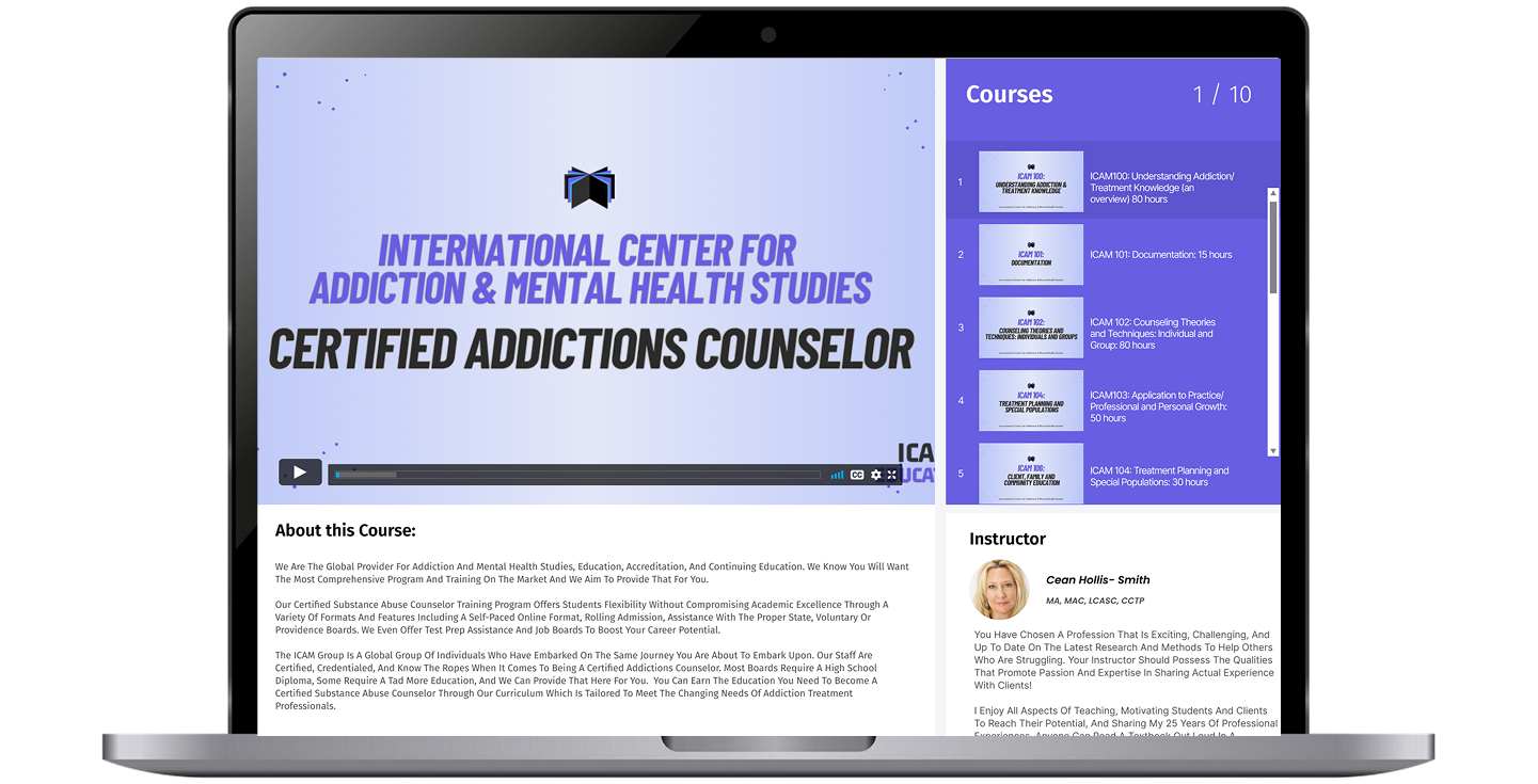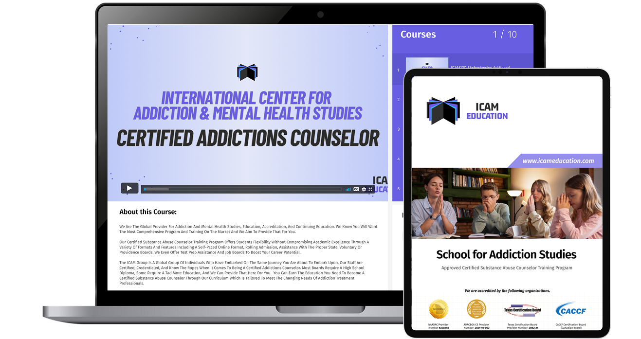At ICAM we offer the most comprehensive and in-depth addictions counselor course training program on the market. We also offer it for less than the other schools AND fully self-study so you can learn at your own pace in your PJ’s. Most of our courses can be translated into college credit hours, so please check with your local college if you are working on a degree.